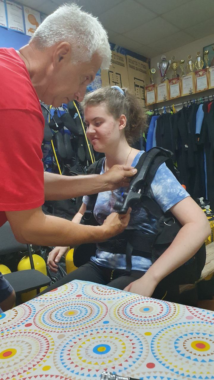 На раскачку времени нет, да и погода не дает расслабляться. Поэтому после знакомства переходим к практическим занятиям: учим подводные знаки, примеряем маски, учимся дышать из регулятора, надевать грузовые пояса и жилеты-компенсаторы. В общем - учимся нырять на берегу. Следующее занятие уже будет "мокрым".
